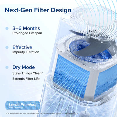 Levoit Superior 6000S kombinerer smart styring, nem påfyldning og kraftig fugtning af store rum uden fugtig tåge takket være højeffektiv ventilatorteknologi. Den fungerer endda med vand fra hanen! I tørretilstand sørger ventilatoren for at fjerne overskydende fugt fra filteret, hvilket forlænger luftfugterens levetid.
